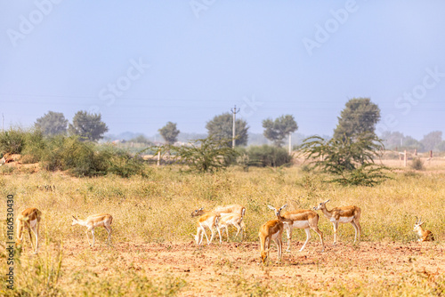 Naklejka premium A Group of black Buck female with its calfs grazing in wild grasslands of bhisnoi village of rajasthan in india