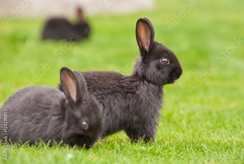 Fototapeta premium A group of bunny rabbits on grass. Shallow depth of field. Focus on the central rabbit.
