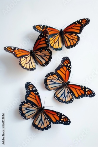 Fototapeta premium A group of butterflies sit on a smooth, white surface