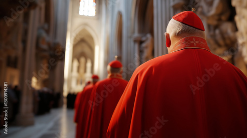 Naklejka premium A group of cardinals in red robes walking through a grand cathedral, with the...