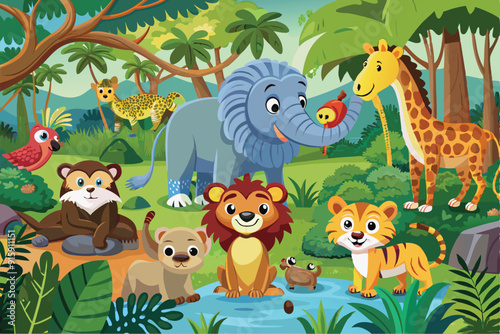 Naklejka premium A group of cartoon wild animals gather by a stream in the jungle, playing and exploring their lush surroundings under the bright midday sun