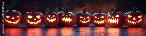 © Quratulain, Obraz premium A group of carved pumpkins with various expressions glowing in unison