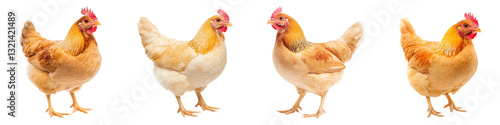 © R Studio, Fototapeta premium A group of chickens including roosters and hens standing together in a traditional farmyard setting with a natural rustic environment