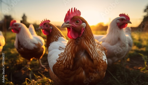 Fototapeta premium a group of chickens on a field at sunset