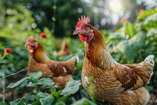 © Ева Поликарпова, Fototapeta premium A group of chickens standing on a lush green field
