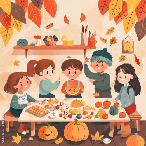 © CreativeLoom, Obraz premium A group of children are sitting at a table with a variety of food