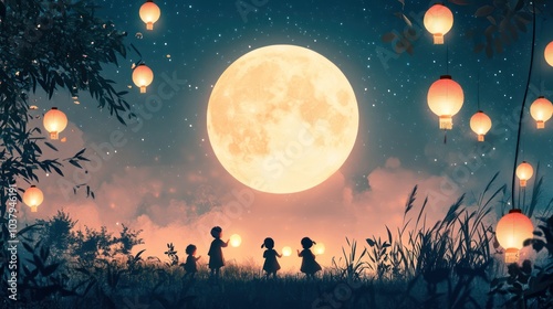 © Charoen, Fototapeta premium A group of children are standing in a field of grass