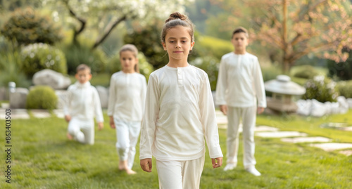 © evgenia_lo, Obraz premium A group of children are wearing white clothing and standing in a grassy area. Scene is peaceful and serene, as the children seem to be enjoying their time outdoors