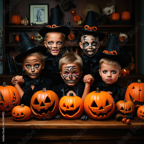 © keks20034, Fototapeta premium A group of children in costumes and with pumpkins at home for Halloween. Generative AI