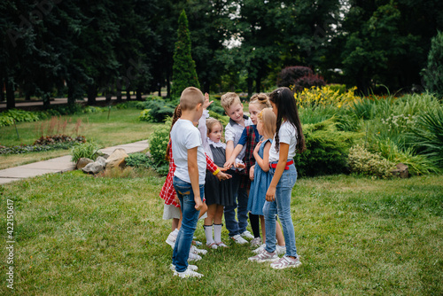 Obraz premium A group of children run around, have fun and play as a larger team in the summer in the Park. Happy childhood