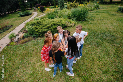 Obraz premium A group of children run around, have fun and play as a larger team in the summer in the Park. Happy childhood