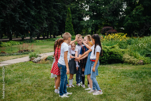 © Andrii, Obraz premium A group of children run around, have fun and play as a larger team in the summer in the Park. Happy childhood