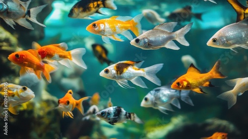 Naklejka premium A group of colorful, diverse fish swimming in a clear aquarium, Symbolizing the beauty of diverse ecosystems