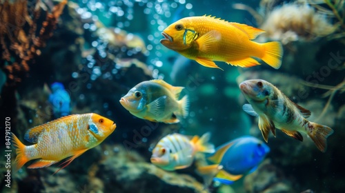 Naklejka premium A group of colorful fish swimming gracefully in a well-decorated aquarium.
