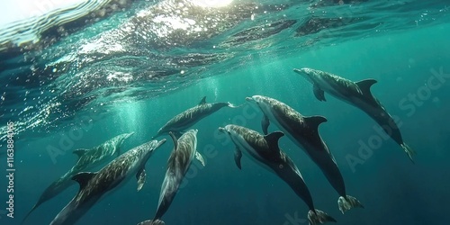 Fototapeta premium A group of common dolphins swimming together, leaping from the water in unison.