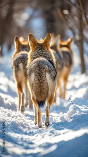 © Iswanto, Fototapeta premium A group of coyotes walking through a snowy path in a serene landscape.