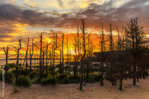 © wewi-creative, Fototapeta premium A group of dead trees with bare branches at sunset on the beach of the North Wales town of Newborough with a beautiful evening orange in the sky.
