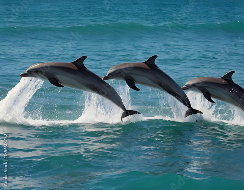 © Muhammad Saleem, Naklejka premium A group of dolphins is splashing and playing in the waves of water in the sea. dolphin jumping out of the water.