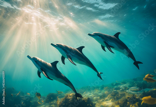 © sebi_2569, Fototapeta premium A group of dolphins swimming in the water