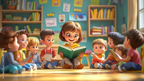 © Kopgz-41, Fototapeta premium A group of elementary students learn together in a colorful classroom setting, sitting at desks with books open, eager to absorb knowledge under the guidance of their dedicated teacher