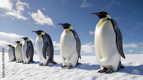 Obraz premium A group of emperor penguins on the snow with a blue sky background