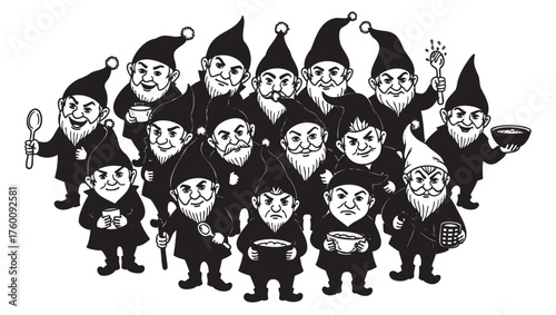 © David, Obraz premium A group of fifteen illustrated gnomes, each with distinct facial expressions, wearing pointed hats and holding various small items.