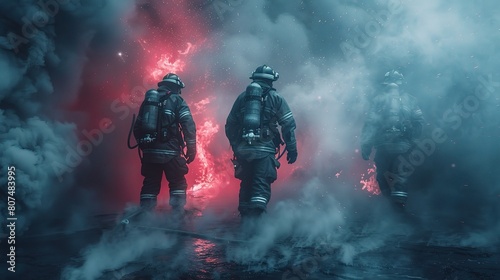 © CLOVER BACKGROUND, Fototapeta premium A group of firefighters working in sync to extinguish a raging blaze, surrounded by billowing smoke