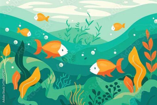 © Thanyaporn, Naklejka premium A group of fish swimming in a green ocean with a blue sky in the background