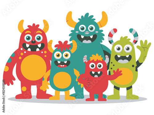 © Ai vector , Naklejka premium A group of five cartoon monsters standing together on a white background