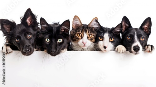 © lililia, Obraz premium A group of five dogs and a cat look over a white surface, their heads and paws visible