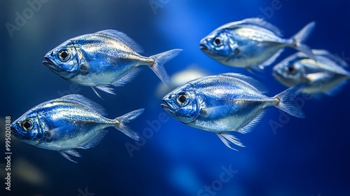 © bcendet, Fototapeta premium A group of five silver fish swim together in a blue tank.