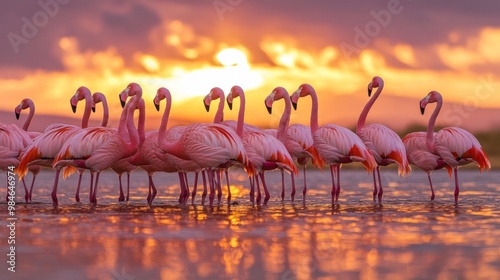 Naklejka premium A group of flamingos standing in water at sunset, showcasing vibrant colors...
