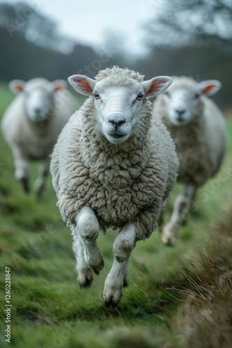 Fototapeta premium A group of fluffy sheep energetically run towards the camera across a lush...