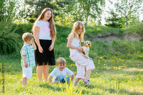 Obraz premium A group of four childrenlaughing, playing and caress little puppy dog gold spaniel in summer glade outdoor.