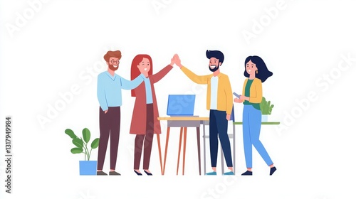 © Ainur, Obraz premium A group of four colleagues celebrating success in a modern office setting.