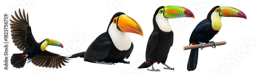 © Faizan, Naklejka premium A group of four toucans in different poses against a plain backdrop with wings and colorful beaks on transparent background