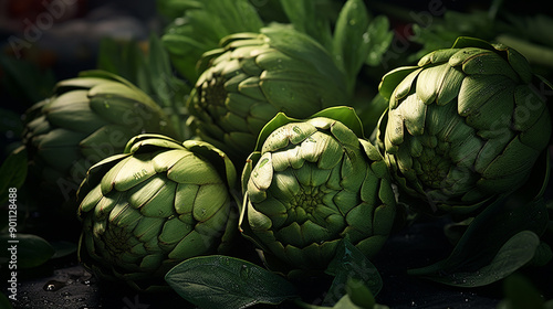 © HAMEEDA, Fototapeta premium A group of fresh, green artichokes.