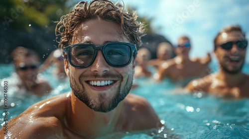 Fototapeta premium A group of friends swim and laugh together in a bright, sunny pool, creating joyful memories during a summer celebration