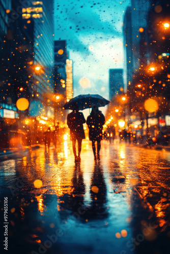 © Wararat, Obraz premium A group of friends walking through the city, enjoying the urban atmosphere and bright lights.