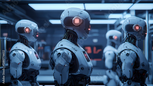 © dudesign, Fototapeta premium A group of futuristic robots with sleek designs, arranged in a modern, high-tech environment, showcasing advanced technology and artificial intelligence.