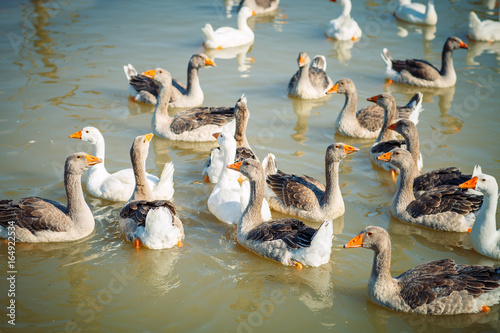 Obraz premium A group of geese on the poultry farm.