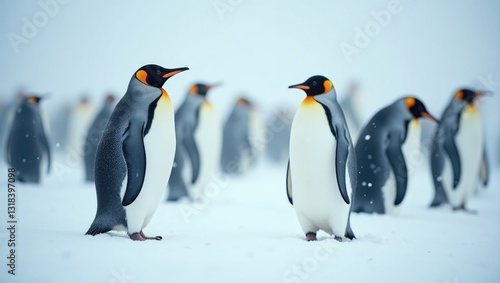 Fototapeta premium A group of gentoo penguins in a snowstorm