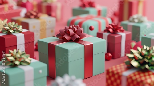 © Galib, Obraz premium A group of gift boxes of various colors on a pink background.