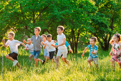 Obraz premium A group of happy children of boys and girls run in the Park on the grass on a...
