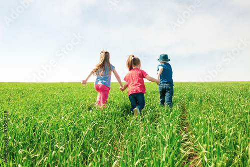 © Andrey, Fototapeta premium A group of happy children of boys and girls run in the Park on the grass on a Sunny summer day . The concept of ethnic friendship, peace, kindness, childhood