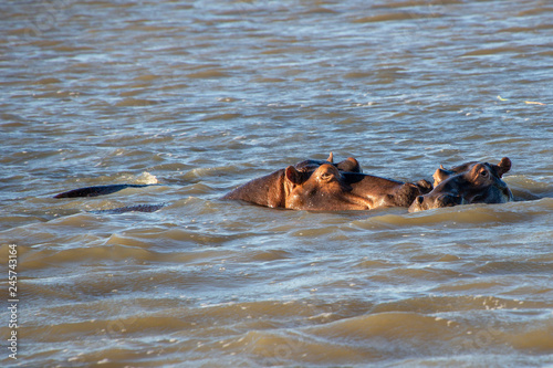 © mikevanschoonderwalt, Fototapeta premium A group of hippos bathe in the river