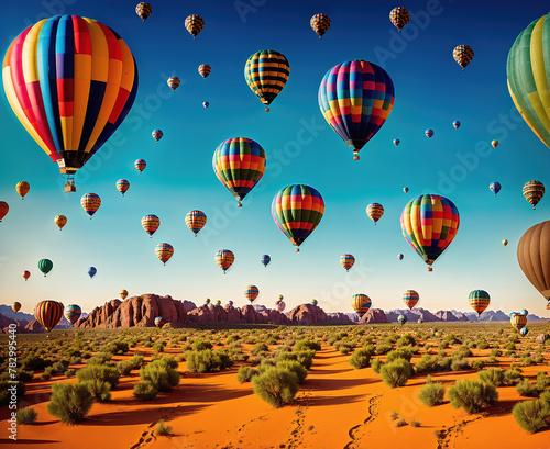 Obraz premium A group of hot air balloons flying over a desert landscape.