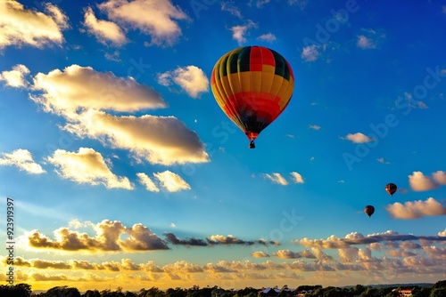 © Natalya, Obraz premium A group of hot air balloons soaring through a clear blue sky
