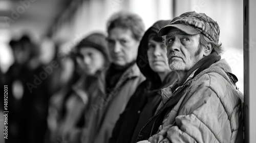 Naklejka premium A group of individuals waiting in a line, showcasing a range of expressions, in a dimly lit urban setting with blurred figures in the background, highlighting themes of patience and resilience