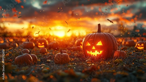 Naklejka premium A group of Jack-o'-lanterns pumpkins in a field of grass with bats flying in...